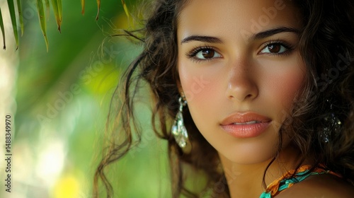 woman, long, hair, colourful, top, wavy, blur, colours, green, background, natural, light, wearing, standing, front, blurred, source, beauty, face, eye, model, fashion, brunette, closeup, people, skin, make-up, lip, smile, lady, person, glamour, black, looking, smiling, coiffure, 1, brown, make-up, teenage