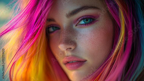 woman, rainbow, hair, make-up, bright, colourful, look, beauty, portrait, female, face, model, young, fashion, attractive, style, person, coiffure, make-up, background, caucasian, blue, red, pretty, skin, glamour, eye, lip, white, lady, closeup, vogue, stylish, pink, art, purple, modern, adult, cute, dark, studio, green, trendy, lipstick, human, elegant, black, blond, summer