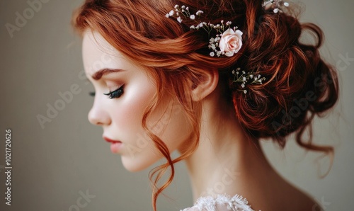 woman, red, hair, flowery, headpiece, pretty, smile, looking, beauty, straight, young, ahead, female, bride, portrait, fashion, face, wedding, dress, bridal, white, coiffure, attractive, elegance, luxury, happy, make-up, style, caucasian, model, person, adult, glamour, marriage, lady, background, love, brunette, flower, cute, jewellery, hand, celebration, close, posing, morning, light, youth, blond