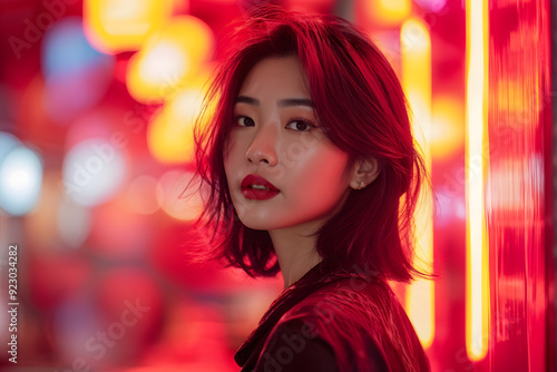 A woman with red hair and red lipstick stands in front of a neon sign