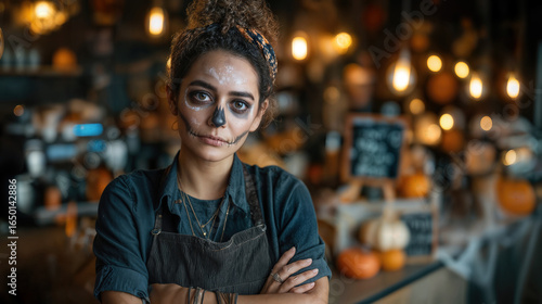 A woman with skull face paint and an apron in a cafe during Halloween