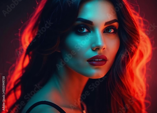 A woman with wavy hair, illuminated by vibrant neon red and blue lights, gazes intensely, her bold beauty enhanced by the dramatic lighting
