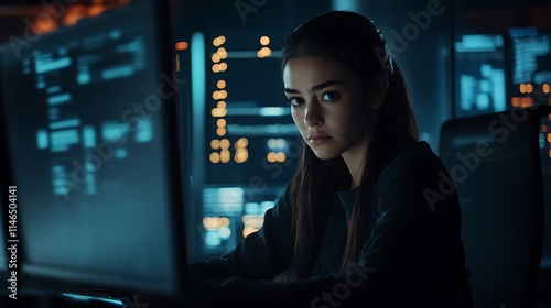 woman, computer, working, dark, room, desk, screen, monitor, keyboard, office, night, blue, light, shadow, focused, concentrated, serious, professional, technology, datum, coding, typing, digital, cyberspace, network, hacker, programmer, analyst, task, project, job, business, future, innovation, progress, artificial, intelligence, code, analysis, security, virtual, cyber, earth