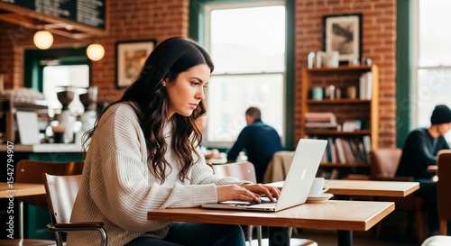 woman, laptop, cafes, hot drink, working, table, indoor, person, chair, brick, window, bookshelf, sweater, cup, drink, eatery, client, counter, business, technology