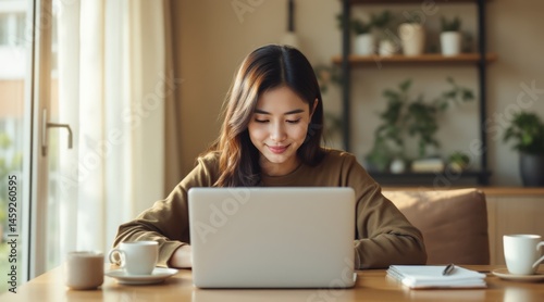 laptop, workspace, home, woman, hot drink, organisation, planning, writing, efficient, remote, motivation, study, entrepreneur, concentration, inspiration, learning, peaceful, notebook, student, comfortable, online, relaxation, sharpened, success, desk, routine, indoor, professional, connection, cyberspace, productivity, education, plant, sunlight, smiling, cosy, work, communication, morning, business, technology, modern, digital, lifestyle, creative, casual attire, cup