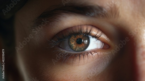 A woman's eye is open and has a greenish-brown color. The eye is surrounded by a dark area, which gives it a mysterious and intriguing appearance
