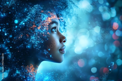 A womans face blends into a digital background of glowing blue particles symbolizing the integration of human identity and technology in a visually stunning futuristic context