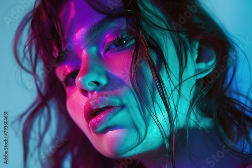 A woman's face illuminated by vibrant blue and pink neon lights, creating a moody and artistic effect.