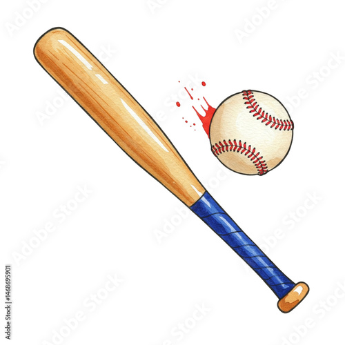 A wooden baseball bat with blue grip next to a fast-moving baseball.
