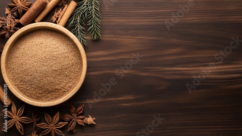A wooden bowl filled with brown sugar sits on a dark wood surface, surrounded by cinnamon sticks and star anise. Warm, autumnal colors create a cozy and inviting atmosphere.