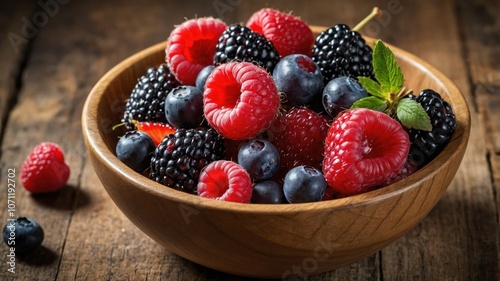 A wooden bowl filled with fresh berries, showcasing vibrant colors and natural textures.