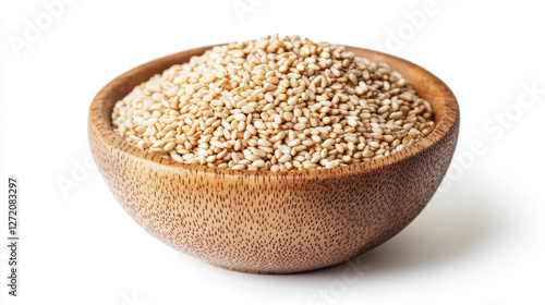 A wooden bowl filled with sesame seeds, isolated against a white background, showcasing a full depth of field