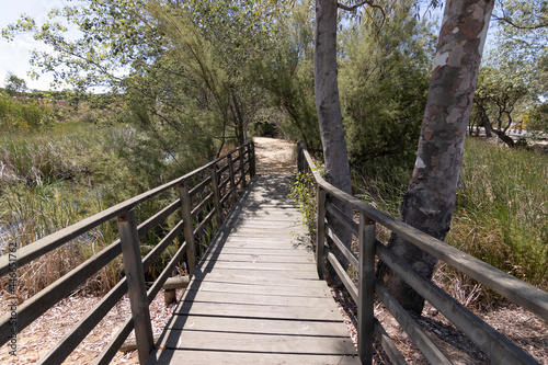 a wooden bridge, in the marshes. A biosphere where hundreds of different birds are located. Bird lover concept.