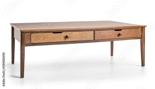 A wooden coffee table with two drawers and four legs sits against a white background.