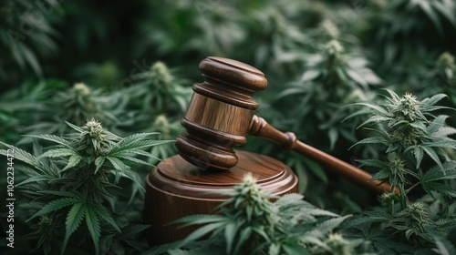 A wooden gavel surrounded by green cannabis plant