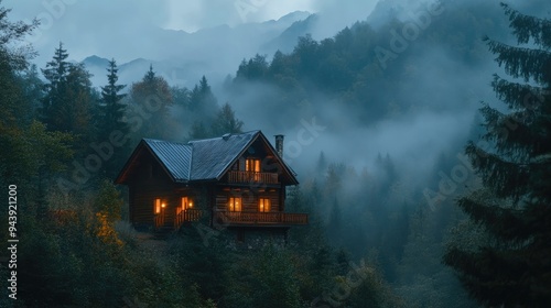 A wooden house nestled in the forest, its warm lights glowing, with foggy mountains in the distance.