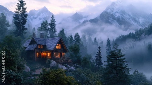 A wooden house nestled in the forest, its warm lights glowing, with foggy mountains in the distance.
