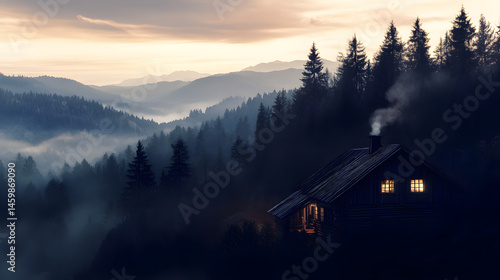 A wooden mountain hut with smoke rising from the chimney, surrounded by tall pine trees and rolling hills in the distance.
