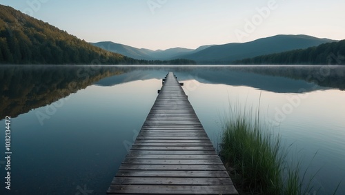 a wooden path to calm lake, landscape nature photo, minimal wallpaper