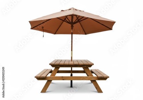 A wooden picnic table with a built-in umbrella isolated on white background