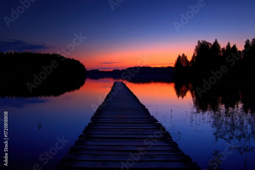 sunset, pier, lake, water, serene, get-away, escape, silhouette, solitude, peaceful, quiet, stillness, explore, relaxation, twilight, tranquil, sunrise, romantic, dusk, idylli, purple, wilderness, horizon, orange, calm, boardwalk, outdoors, blue, sky, journey, tree, colourful, vacation, scenery, wood, evening, scenic, nature, destination, travel, natural, summer, beautiful, adventure, landscape, forest
