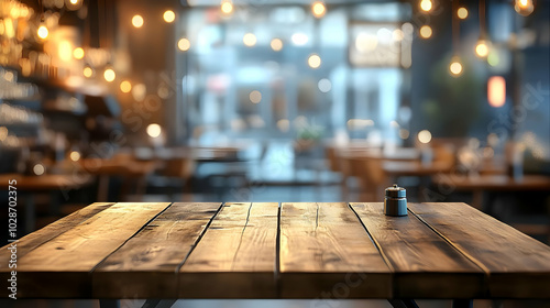 A wooden table in a cozy café with ambient lighting and blurred background.