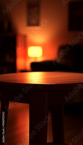 A wooden table sits in the warm glow of a living room. The soft light casts a warm glow on the tabletop, inviting a sense of comfort and relaxation.