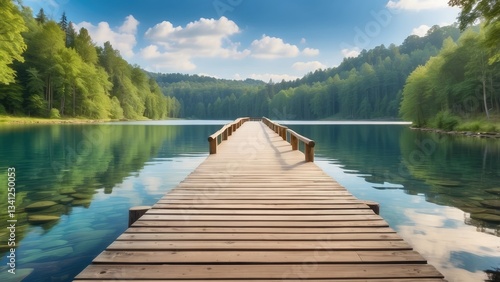 water, lake, boardwalk, greenery, clear sky, nature, calmness, peace, serenity, beauty, harmony, escape, seclusion, photo, contemporary, landscape, tree, scenic, forest, ecosystem, environment, freshness, travel, adventure, exploration, scenic route, zen, relaxation, meditative, hiking, tour tourism, ecotourism, rustic, untouched, verdant, vibrant, paradise
