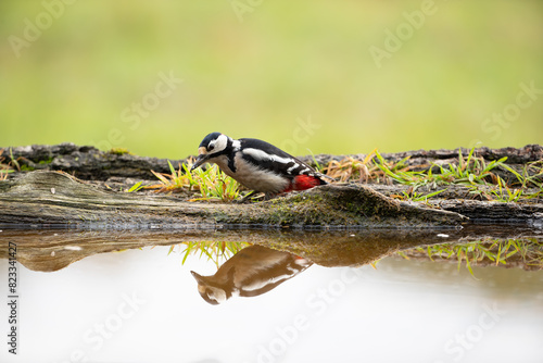 animal, autumn, beak, beautiful, bird, birding, bird, colours, colourful, common, environment, europa, european, feather, forest, green, green background, habitat, nature, ornithology, plant, poland, scenery, sunlight, water, wild, wild animal, wildlife, wing, woodpecker