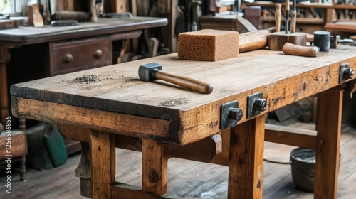 A workbench with a chisel, hammer, and sponge for cement removal.