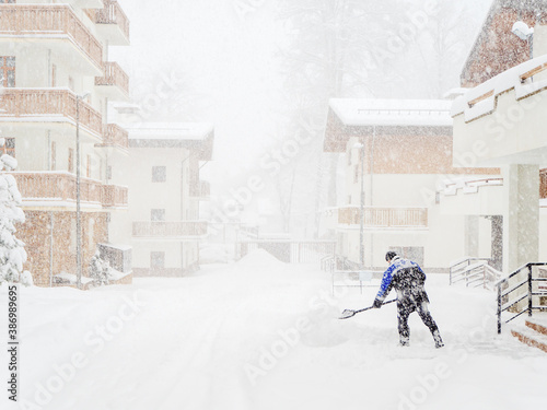 man, uniform, clear, terrain, snowfall, yard, blizzard, fog, snow, vale, hotel, resort, heavy, snowflake, noise, cloudy, residential, building, ski, balcony, localization, snowdrift, service, visibility, concierge, clean, road, cleaner, overall, street, men at work, season, maintenance, winter, weather, employee, chore, equipment, manual, removing, staff, working, park, white, labor, nature, path, shoveling, copy space