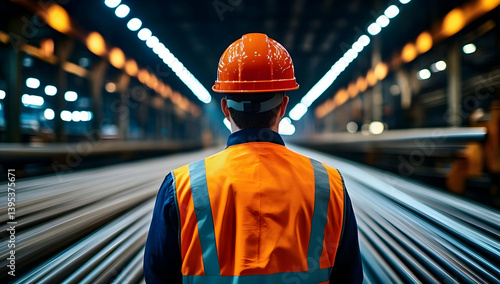 A worker in an orange safety vest and hard hat observes metal pipes in a manufacturing facility, emphasizing industrial safety.