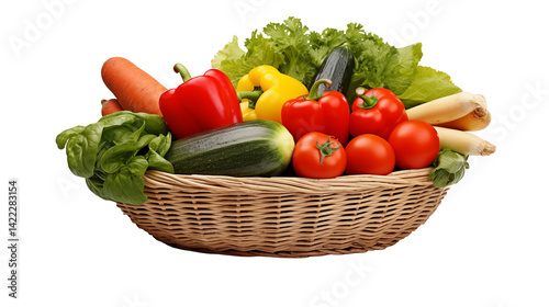A woven basket filled with a variety of fresh vegetables and leafy greens isolated on transparent background