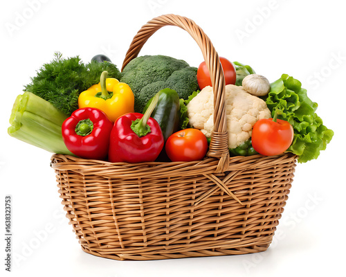 basket, vegetable, fresh, healthy, food, produce, broccoli, cauliflower, pepper, tomatoes, celery, dill, lettuce, courgette, mushroom, yellow pepper, red pepper, green pepper, organic, garden, harvest, nourishment, diet, vegetarian, vegan, raw, ingredient, cooking, culinary, still life, white background, isolated, closeup, natural, vibrant, colourful, farm, market, grocery, shopping, kitchen, table, arrangement, wicker, handle, full, abundance, woven