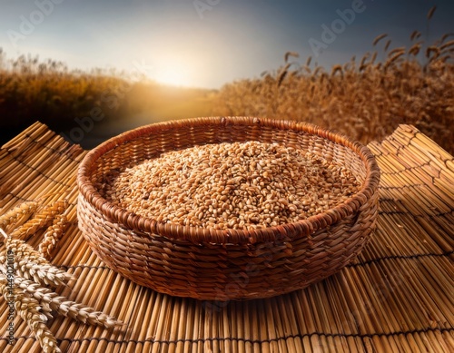 A woven reed tray filled with freshly harvested grains