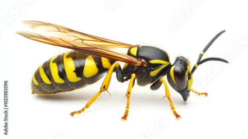 wasp, insect, bug, animal, nature, wildlife, yellow, black, stripes, wing, antennae, macro, closeup, isolated, white background, studio, photo, fauna, invertebrate, arthropod, hymenoptera, sting, venom, pest, summer, garden, flying, buzzing, pollinator, dangerous, scarey, creepy, crawling, small, delicate, fragile, detail, pattern, texture, colours, bright, contrast, light, shadow, biology, entomology, science, education