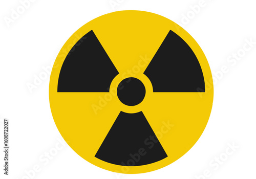 A yellow circle with three black triangle shapes radiating from a central black circle symbol of radiation