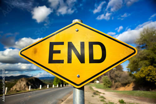 A yellow diamond-shaped road sign displaying the word "END," set against a blue sky with clouds and greenery.