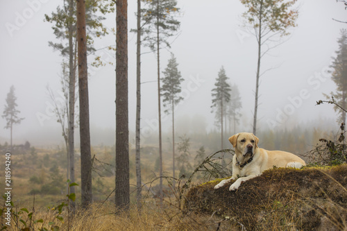 A yellow labrador dog in a Finnish autumn forest. It is foggy and gray weather.