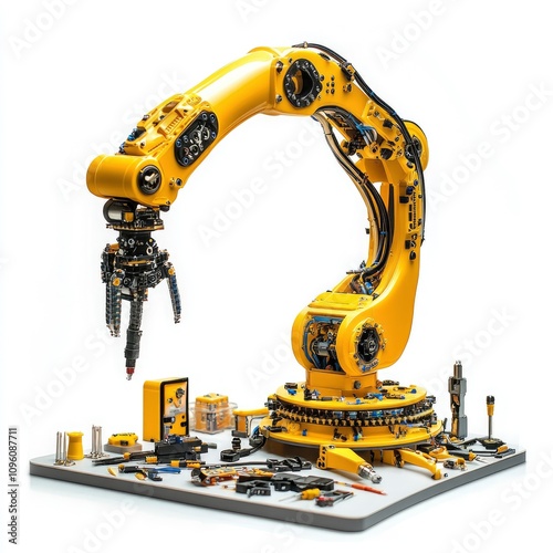 A yellow robotic arm with various tools, designed for industrial automation tasks.