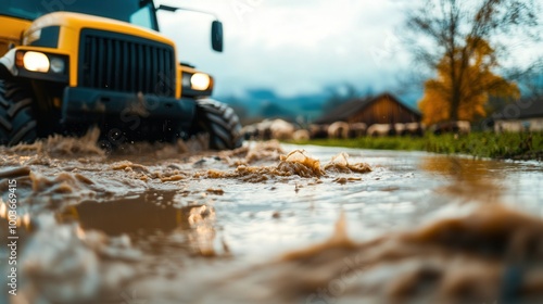 water, climate, crisis, machinery, splash, heavy, rain, wet, land, vehicle, seasonal, harvest, farming, earth, dirt, scenery, transport, motion, productivity, dirtied, tree, crop, tractor, flood, rural, mud, terrain, muddy, industry, outdoors, yellow, equipment, field, nature, country, environment, puddle, background, countryside, landscape, agriculture