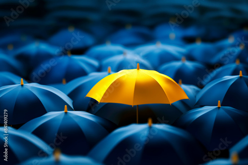 umbrella, yellow, blue, background, concept, creative, uniqueness, standout, individuality, difference, contrast, diversity, creativity, crowd, distinction, exceptional, prominent, singular, unique, variation, variety, dark, light, protective, shelter, rainy, weather, waterproof, fabric, metal, nylon, plastic, accessory, autumn, climate, colours, distinct, individual, lead, leadership, metaphor, monochrome, nonconformist, ai, generative, illustration