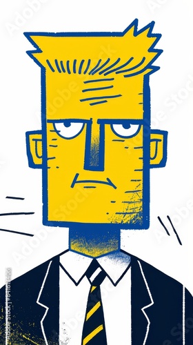 illustration, artwork, man, suit, attaching, frowning, blue, sky, yellow, skin, serious, emotion, art, abstract, psychological, background, line art, face, eye, white, digital artwork, portrait, character, drawing, design, vector, minimalist, modern, contemporary, simple, flat, bold, graphic, mood, feeling, expression