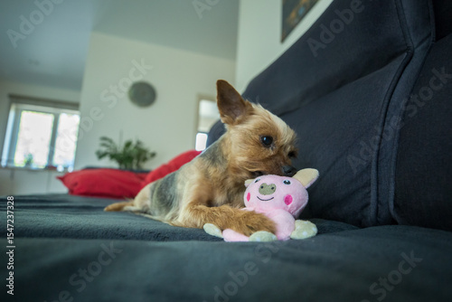 yorkshire terrier, dog, puppy, pet, sofa, toy, stuffed toy, pig, cute, cosy, rest, play, fun, home