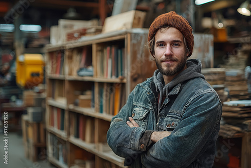 A young adult constructing a wooden bookshelf, following a guide they researched themselves. Concept of DIY independence and creativity.