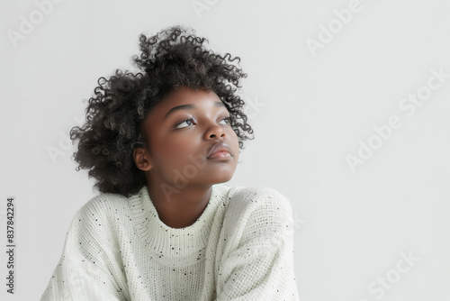 A young African American girl with curly hair, wearing a light-colored sweater. Her thoughtful expression and stylish attire convey a sense of modern elegance.