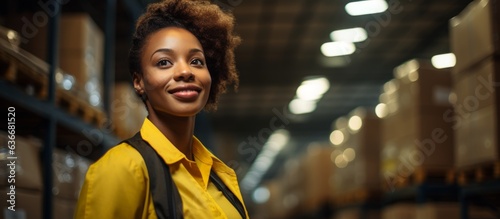 A young African woman takes center stage amidst the controlled chaos of a warehouse. Adorned in a high visibility vest, she stands beside a carton box, showcasing her active role. The backdrop consist