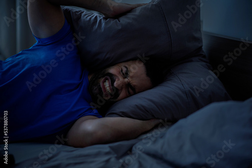 A young arab man holds a pillow with two hands covering his ears from the loud noise at home, a sleepless night, close-up with free space