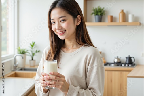 A young Asian woman in a casual sweater holds a glass of milk while smiling in a modern kitchen with wooden accents and houseplants, creating a warm and inviting atmosphere.