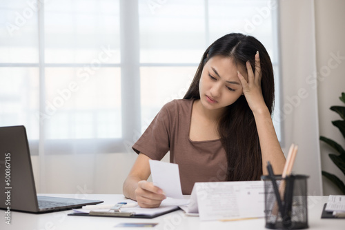 A young Asian woman is stressed because she looks at many expense bills and she has no money to pay them. Hand on head feeling very serious depressed.